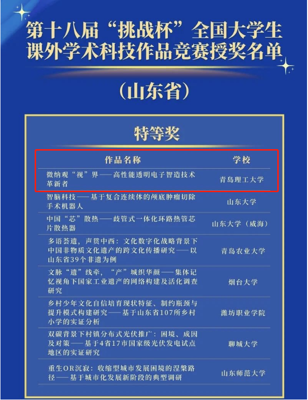 10月30日,第十八届“挑战杯”全国大学生课外学术科技作品竞赛在贵州大学落下帷幕,经过激烈角逐,球王会体育官方网参赛项目《微纳观“视”界——高性能透明电子智造技术革新者》(指导教师:朱晓阳、兰红波、杨建军;团队成员:王瑞、周君仪、段培开、张友超、商帅、台玉平、于志浩、张金宝)勇夺主体赛全国特等奖,创造了球王会官网在此项竞赛中首次获特等奖记录。此项成绩也是球王会体育官方网在“挑战杯”系列竞赛中的最好成绩,实现了赛事重大突破。