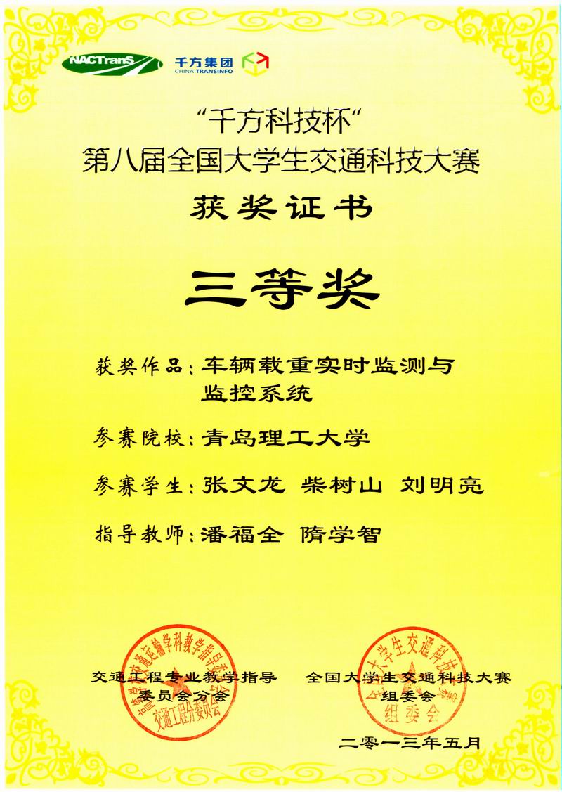 5月25日至26日,由教育部高等学校交通运输与工程学科教学指导委员会主办、北京工业大学承办,以“顺畅交通”为主题的第八届全国大学生交通科技大赛决赛在北京举行。本届大赛共有全国86所大学报名,198件作品参加选拔,经过专家组评审,仅有来自51所学校的80件作品进入决赛。球王会官网由潘福全、隋学智老师指导,张文龙、柴树山、刘明亮同学合作完成的《车辆载重实时监测与监控系统》荣获三等奖。