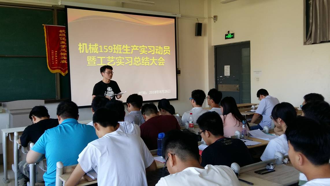 8月26日下午,在主教学楼B528教室召开2015级卓越班生产实习动员会暨工艺实习总结会,学院党委林海涛副书记、教学副院长杨勇教授、辅导员张建军老师、实习总负责人江京亮老师出席了本次会议,2015级卓越班全体实习同学参加动员会。