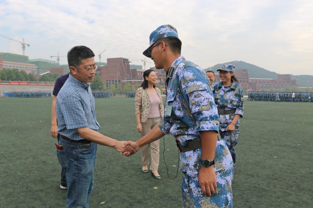 学院领导到达训练场后,在随训辅导员老师的带领下,岳丽宏书记一行人依次走访了正在场上进行训练的七个学生连队,与每一位教官握手以示感谢,同时也对每一位正在认真训练的同学表示肯定和鼓励,同学们对于领导、老师们的关怀表现出极大的热情和感激。随后,岳丽宏,郭峰为每一位教官送上暖心礼品,以此表达对各位教官军训期间认真负责的赞许及辛勤付出的感谢,并与各教官合影留念。最后,岳丽宏也不忘对随训辅导员老师们表示关心,感谢他们一直以来的辛勤陪伴。