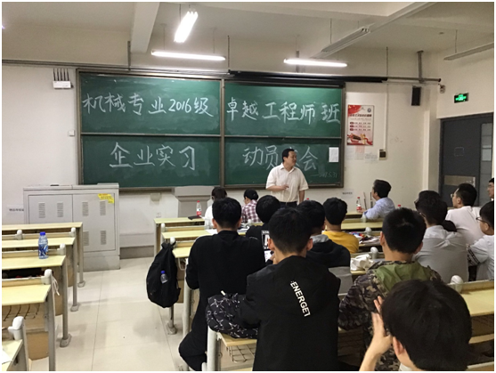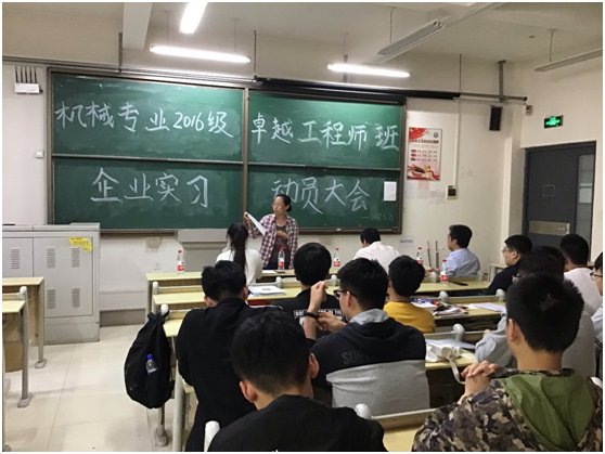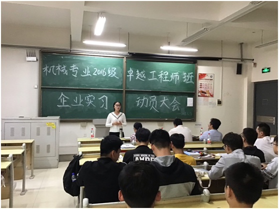 2019年5月31日,球王会体育官方网卓越工程师试点机械1610班举行了“企业实习动员大会”,学院林海涛副书记、杨勇副院长、卓越工程师计划负责人江京亮老师、班主任李淑云老师、辅导员吴静老师参加动员大会。