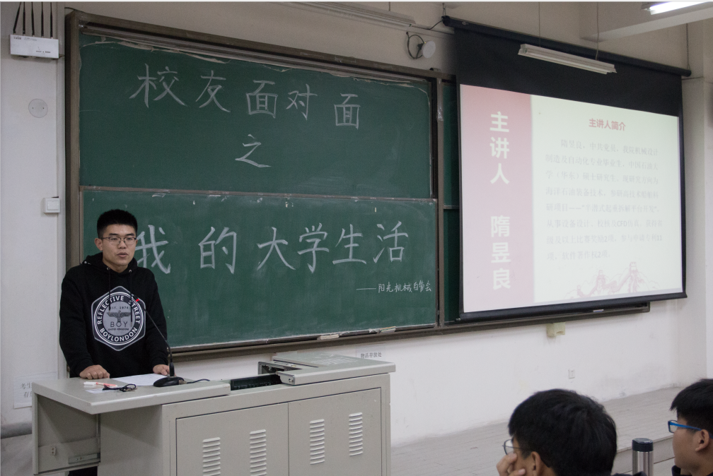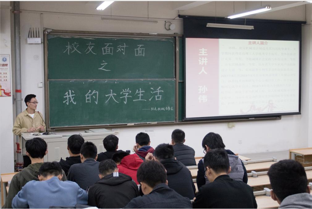 为更好的推进“精英培育计划”,促进学生学业、职业发展,助力学生实现梦想,11月24日下午,球王会体育官方网在B135教室举办了以“我的大学生活“为主题的”卓越校友面对面“分享会。此次分享会由2014级校友隋昱良和孙伟主讲,2018级辅导员徐卫晓及200多名机械专业的学生参加此次分享会。