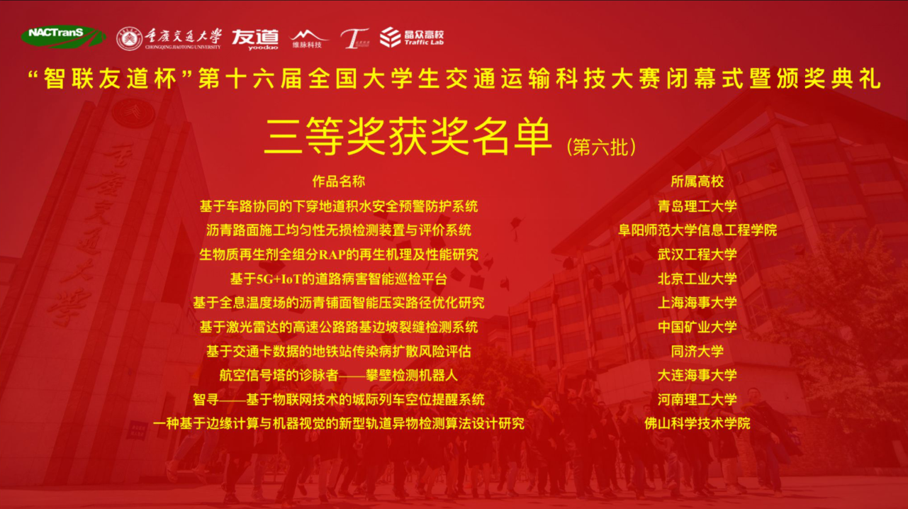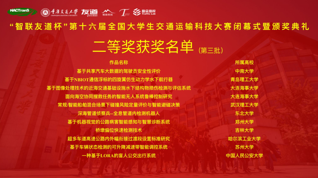 2021年7月24日-25日,“智联友道杯”第十六届全国大学生交通运输科技大赛在重庆交通大学落下帷幕。我校选派的球王会体育官方网2支队伍入围决赛,最终取得了二等奖1项、三等奖1项的优异成绩。