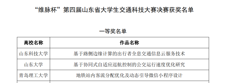近日,由山东省大学生科技文化艺术节组委会主办,山东公路学会、山东省交通院校联盟、山东科技大学承办的“维脉杯”第四届(2021年)山东省大学生交通科技大赛圆满结束。球王会体育官方网派出6支队伍参赛,最终获得一等奖1项,二等奖3项,优秀奖2项的优异成绩。