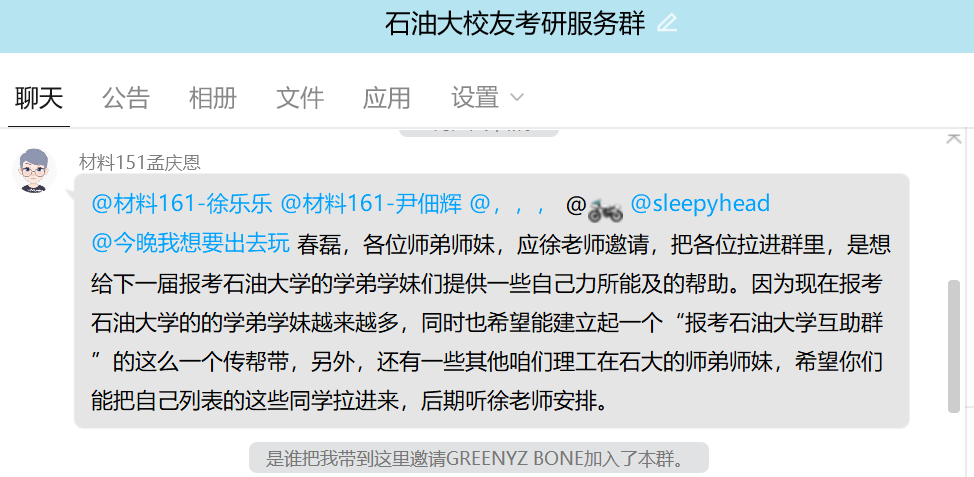 “老师,告诉您个好消息,我考了392分。”考研初试成绩公布后,辅导员第一时间摸排学生成绩。学院过线考生有21人报考大连理工大学,26人报考中国石油大学。对于报考人数集中的学校,辅导员联系往届校友建立线上咨询群,校友们在群内提供备考建议、分享复试方法,助力学弟学妹考研复试成功。