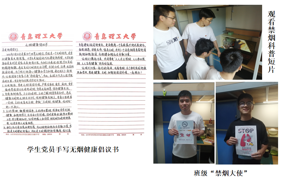 5月31日第35个世界无烟日来临之际,为促进学生身心健康,杜绝吸烟引起的安全隐患,营造清新的校园环境,5月20日-5月31日,机械与汽车工程学院学生党支部组织开展“摒弃烟草陋习,共建清新校园”主题党日活动。