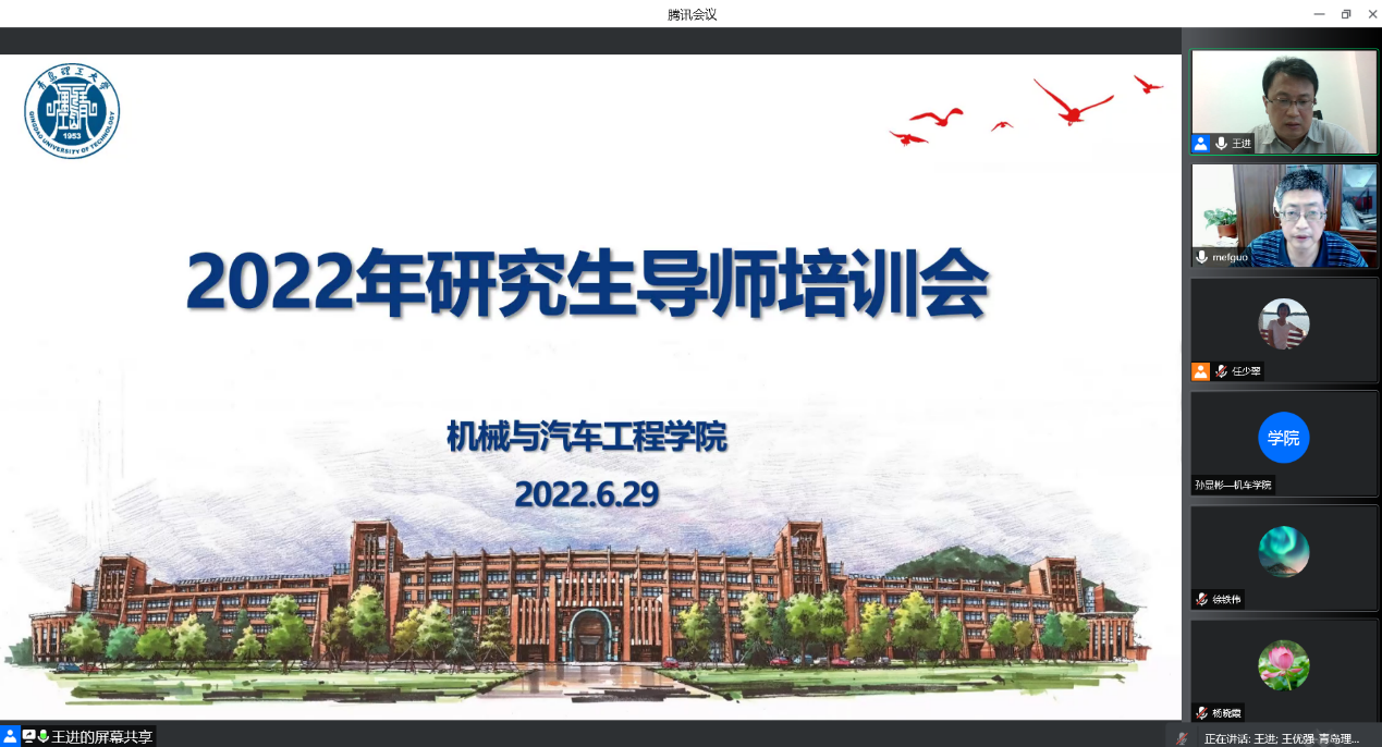 为进一步加强学院研究生导师队伍建设,强化导师的责任担当和育人使命,规范研究生培养,提升研究生培养质量,球王会体育官方网于6月29日下午在线召开2022年研究生导师培训会。学院党委书记李忠晓、院长郭峰、副院长王进及研究生导师70余人参加,会议由王进主持。