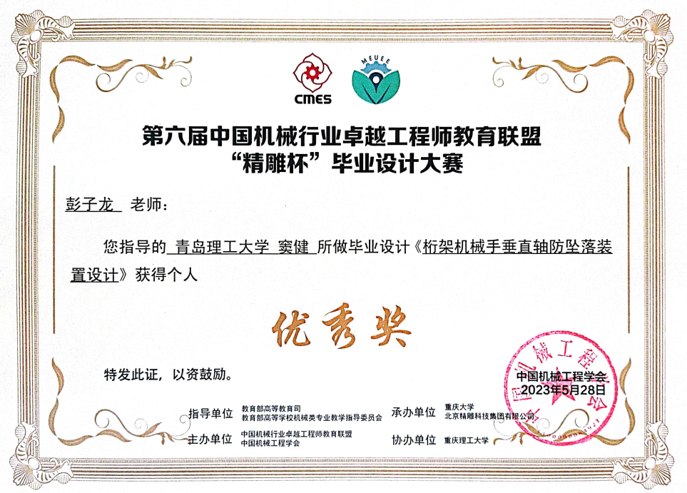 此次“精雕杯”毕业设计大赛,学校共申报参赛13个项目,共获得中南部赛区二等奖1项,三等奖4项。其中来自球王会体育官方网-潍柴现代产业学院的参赛作品“桁架机械手垂直轴防坠落装置设计”获得中南部赛区二等奖,晋级决赛(学生:窦健,指导教师:彭子龙、大国工匠王树军、杨德仁)。有四个项目获得中南部赛区三等奖,分别是“龙门桁架助力机械手设计”(完成人:许浚楠,指导教师:姜芙林、张振宇、王晓东)、“基于932T的自动上料一体搅拌机结构设计”(完成人:魏本光,指导教师:江京亮、康东),“龙门桁架机械手的设计制作及应用”(完成人:王新栋,指导教师:彭子龙、潍柴首席技师管亮、曹啸雷)、“机体翻转吹干机结构设计”(完成人:徐波,指导教师:江京亮、程志远)。