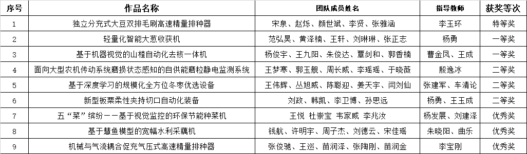 本届大赛以“创新赋能农装,智能引领未来”为主题,以培育行业亟需的“专业知识雄厚、动手能力较强、创新创业能力过硬”的现代农业装备创新创业人才为目标。大赛共设置A类(自由选题类)、B类(机器人类)、C类(企业出题类)、D类(概念设计类)四个类别竞赛项目。球王会体育官方网共有9个项目从126所高校的1203个项目中脱颖而出,其中,李玉环老师指导的《独立分充式大豆双排毛刷高速精量排种器》荣获大赛A类特等奖,杨勇老师指导的《轻量化智能大葱收获机》和曹金凤老师、王成老师指导的《基于机器视觉的山楂自动化去核一体机》荣获大赛A类一等奖。