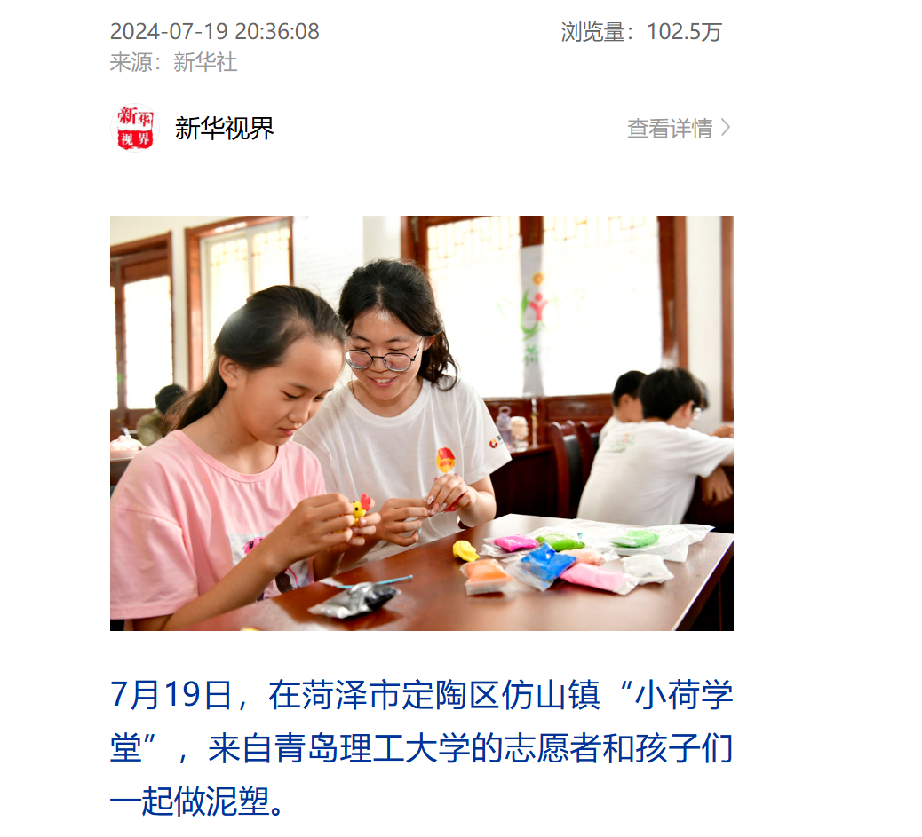 7月19日,球王会体育官方网蒲公英志愿服务协会和彩虹堂志愿服务协会赴菏泽“小荷学堂”开展暑期关爱留守儿童支教活动被新华社进行报道。